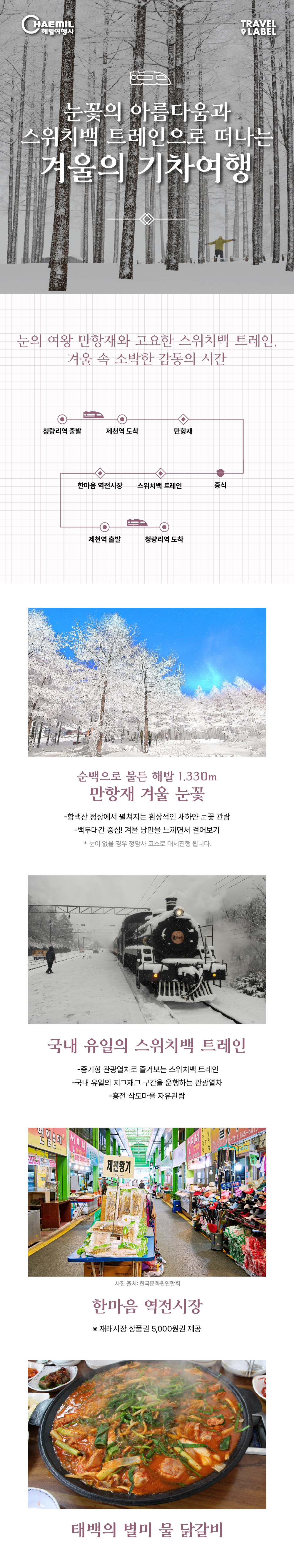 특급열차로 떠나는 해발 1,330m 만항재 겨울 눈꽃 관람과 국내 유일의 스위치백 트레인 체험까지, 트래블레이블과 해밀여행사가 함께 합니다.